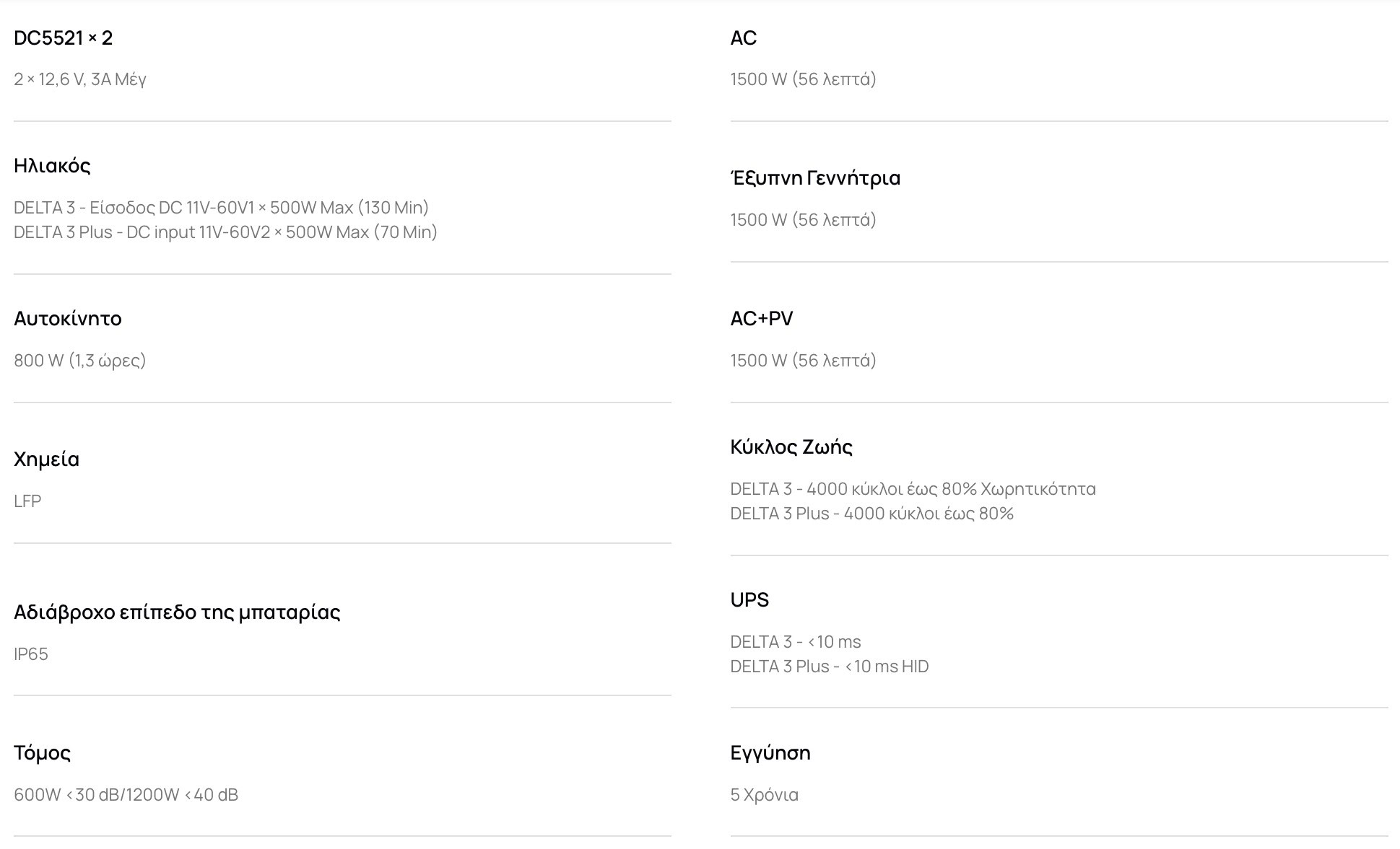 • Επεκτάσιμη χωρητικότητα 1-5 kWh με DELTA 3 Extra Battery, DELTA Pro 3 Extra Battery, DELTA 2 Extra Battery ή DELTA 2 Max Extra Battery.