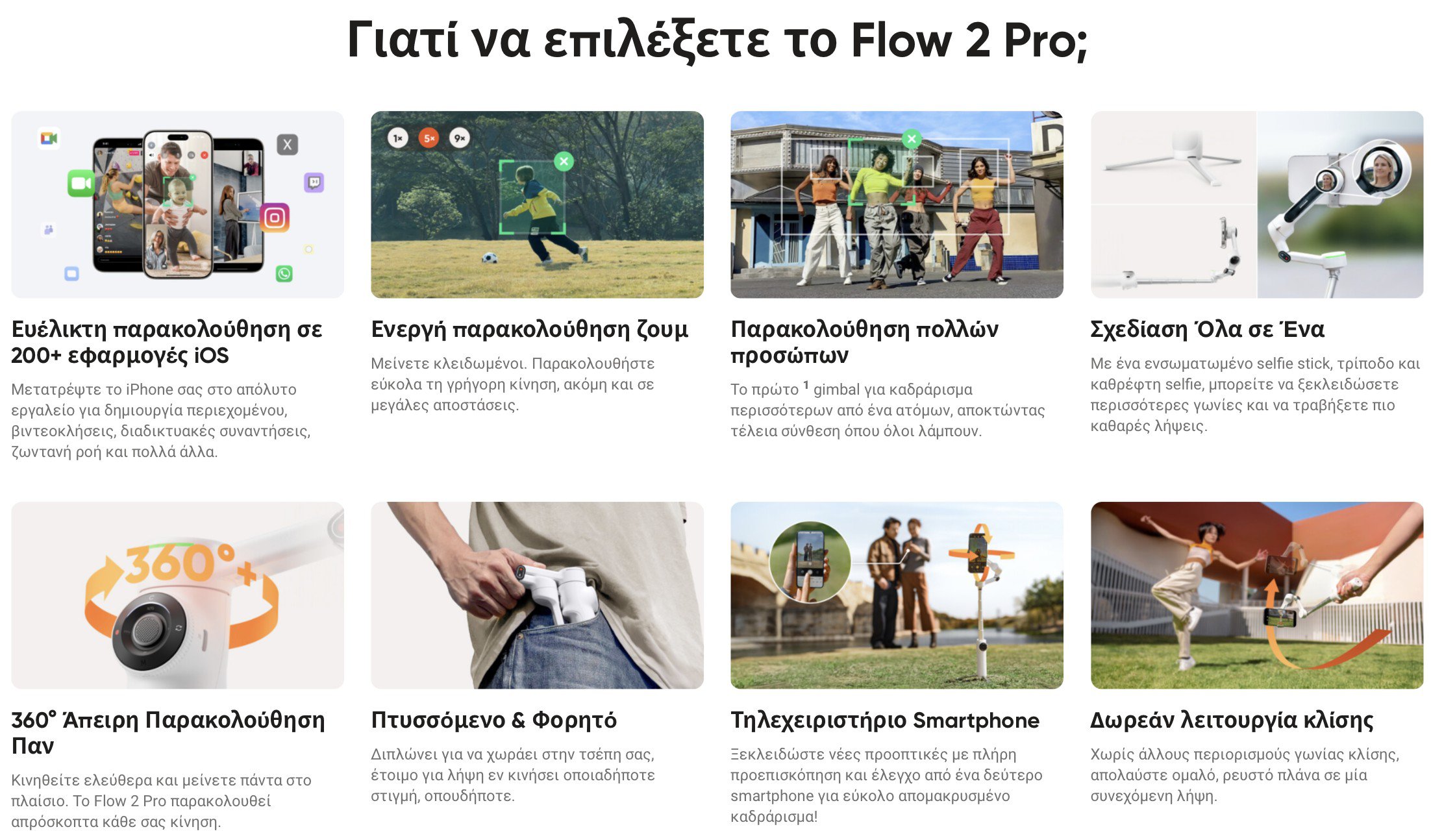 Χωρίς να χρειάζεται να κρατάτε το τηλέφωνό σας, κινηθείτε ελεύθερα όταν συνομιλείτε με φίλους και αγαπημένους, γνωρίζοντας ότι θα παραμείνετε πάντα στο κάδρο. Εγγυημένη ομαλή ροή. Το Flow 2 Pro σας κρατάει στο επίκεντρο της προσοχής.