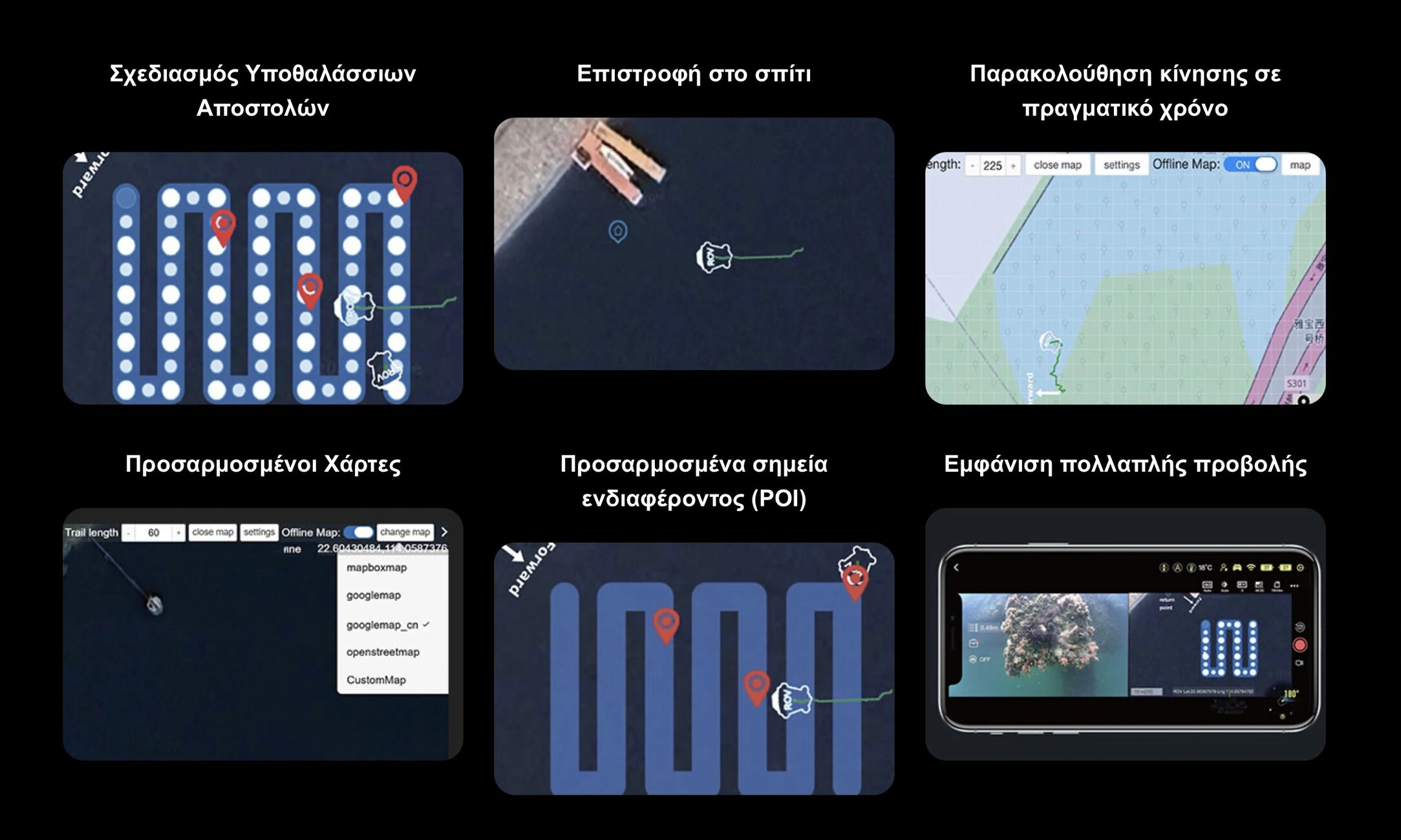 Το σύστημα U-INS προσφέρει προηγμένη αυτόνομη πλοήγηση για το FIFISH E-MASTER χρησιμοποιώντας δεδομένα βαθιάς εκμάθησης και αισθητήρων για την παροχή ακριβών πληροφοριών θέσης, ταχύτητας, κατεύθυνσης και στάσης. Υποστηρίζει αυτοματοποιημένο σχεδιασμό διαδρομής, διαισθητική επιστροφή με ένα κλικ και παρακολούθηση κίνησης σε πραγματικό χρόνο με οπτική αναφορά ιστορικών μονοπατιών. Οι χρήστες επωφελούνται από την αποτελεσματική, αυτοκαθοδηγούμενη κίνηση και τη λεπτομερή απεικόνιση θέσης και τροχιάς, συμπεριλαμβανομένων προσαρμοσμένων χαρτών και εγγραφής POI.