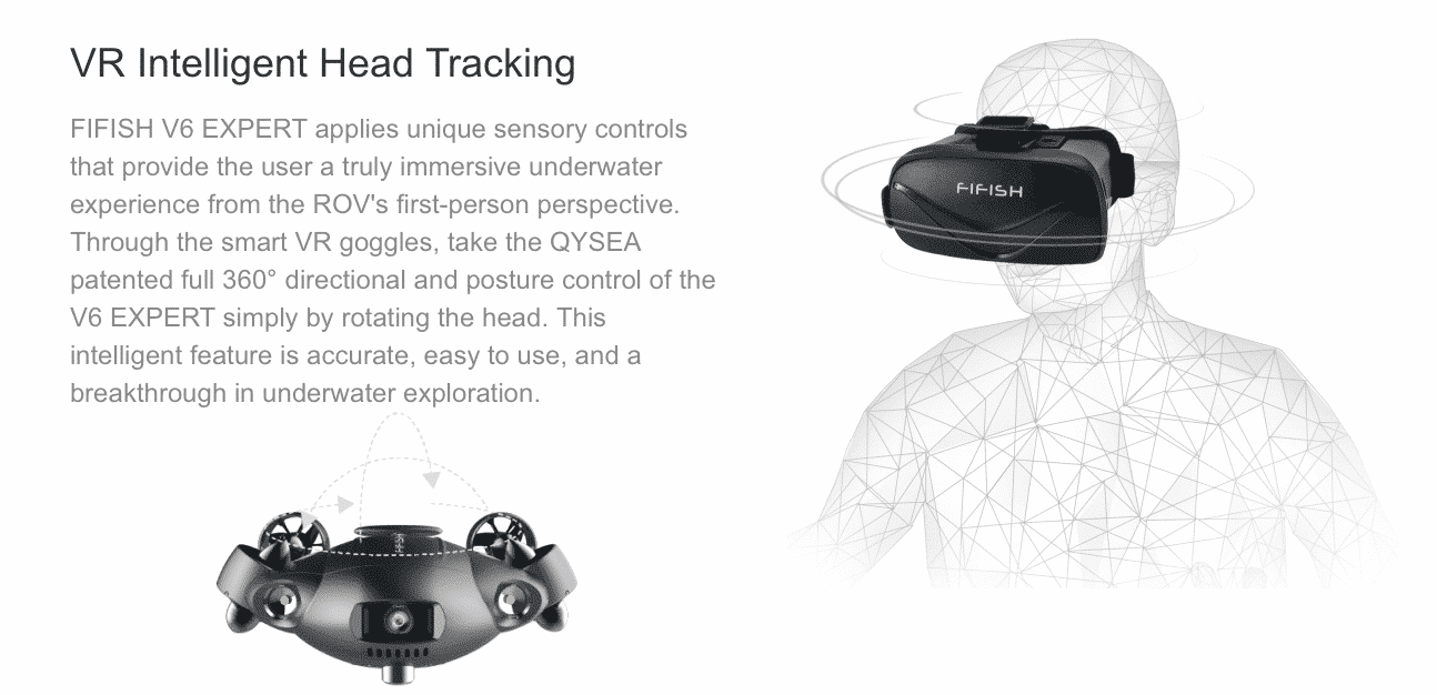 Επιπλέον, το υποβρύχιο drone εφαρμόζει μοναδικά αισθητήρια στοιχεία ελέγχου που παρέχουν στον χρήστη μια πραγματικά συναρπαστική υποβρύχια εμπειρία. Επίσης, μέσω των έξυπνων γυαλιών VR, μπορείτε να πάρετε τον πλήρη έλεγχο 360 ° κατεύθυνσης και στάσης του V6 EXPERT απλά περιστρέφοντας το κεφάλι.